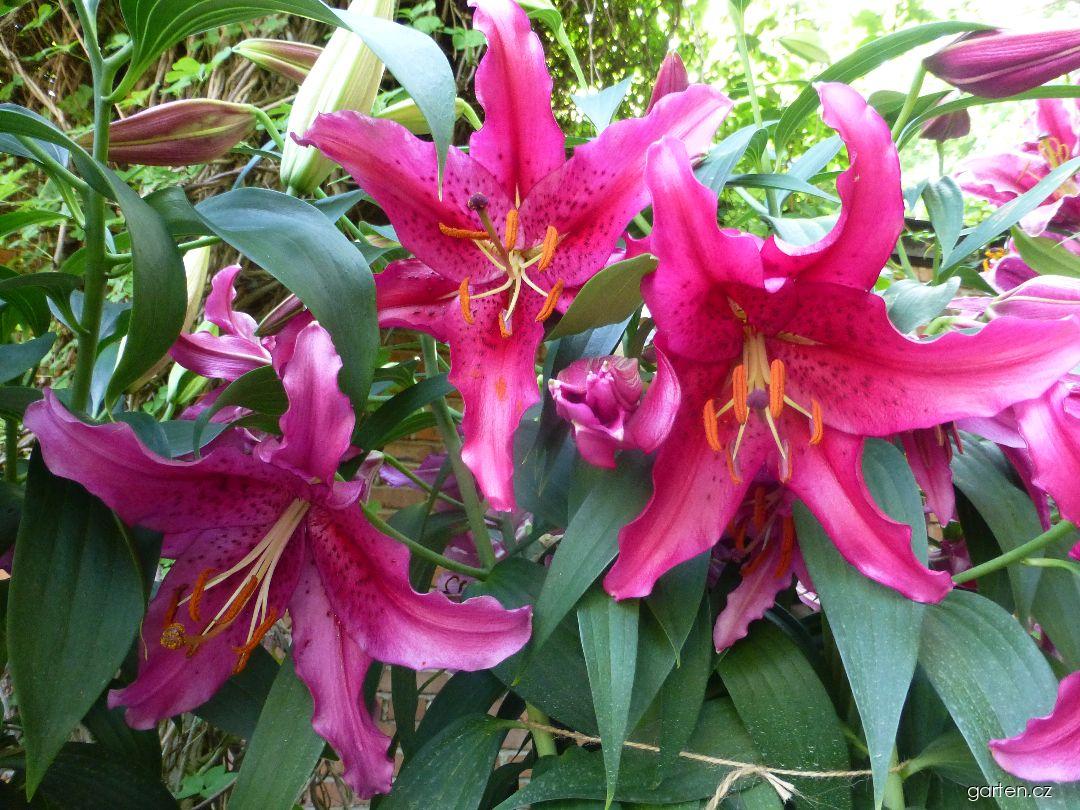 Barva květů: červená, (květy červené s rudými tečkami) Výška: 70 cm Místo: Dendrologická zahrada Průhonice Rostliny z rodu Lilium: