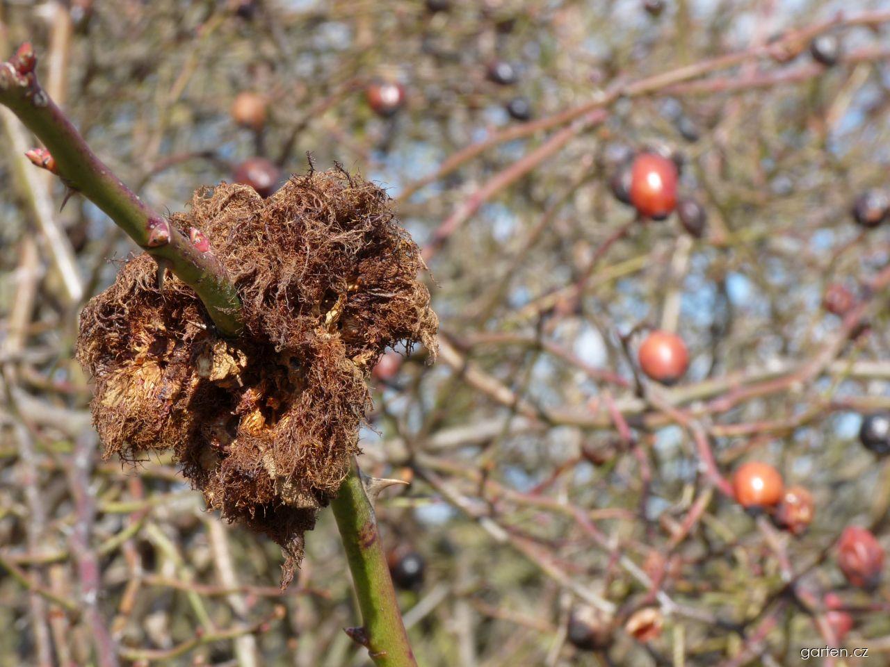 Žlabatka růžová - Diplolepis rosaeDiplolepis rosae - žlabatka růžová Hálky na růžích Hálky se tvoří na listu, řapíku nebo na tenké větvičce růže šípkové. Mají různou velikost, jsou porostlé dlouhými rozvětvenými zelenými, žlutými až červenými chlupy. Imago klade na jaře na povrch pupenu nebo větvičky více vajíček. Larvy si vytvářejí komůrky… | |